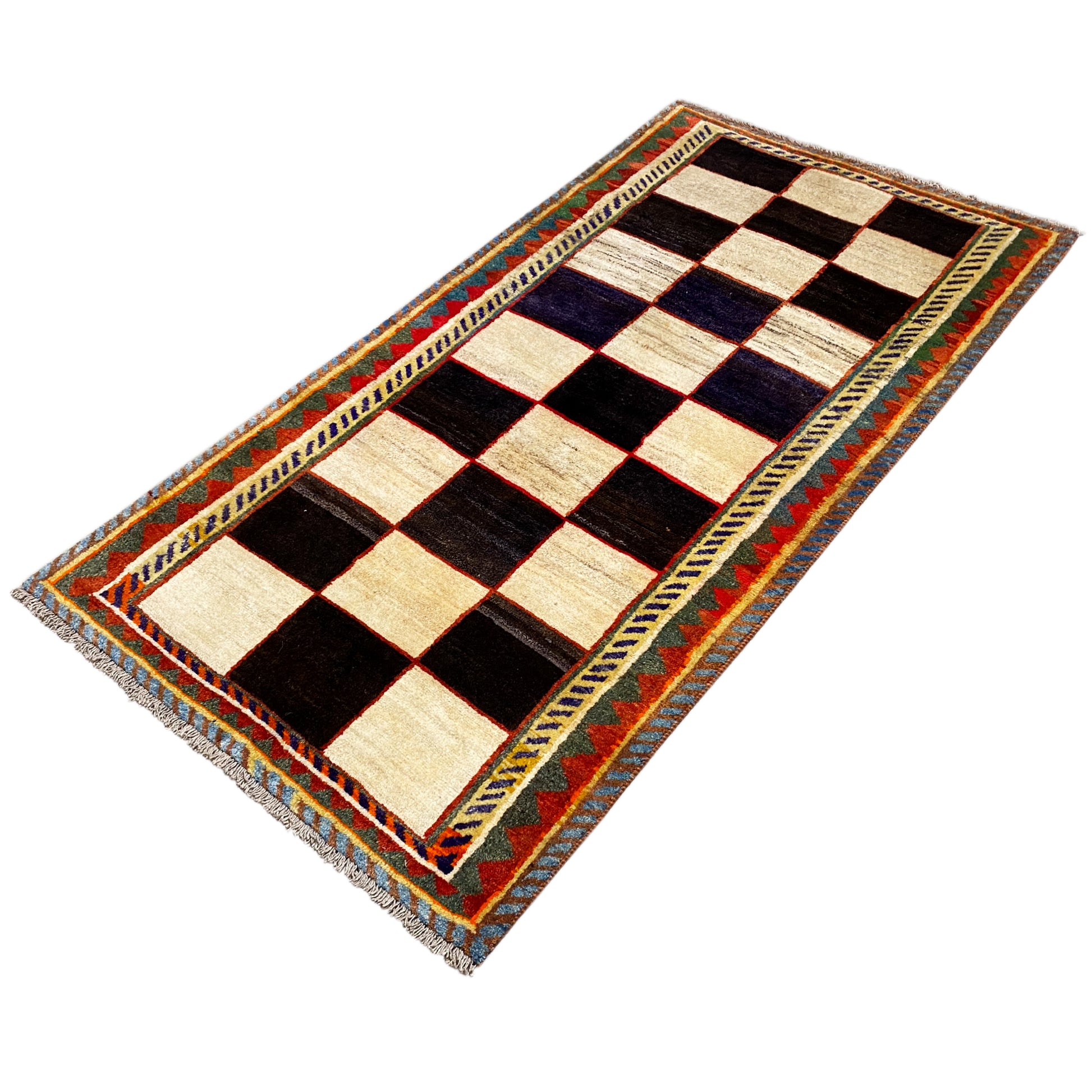 Dieser ausdrucksstarke, handgeknüpfte Gabbeh Läufer aus handgesponnener, pflanzengefärbter Wolle fasziniert mit einem klassischen schwarz-weißen Schachbrettmuster, umrahmt von einem lebhaften, mehrfarbigen Rand. Mit seinen Maßen von 194x100 cm ist er ein markantes Statement-Stück, das Fluren, Eingangsbereichen oder länglichen Räumen eine dynamische und zugleich zeitlose Ästhetik verleiht. Die Kombination aus traditioneller Handwerkskunst und dem grafischen Muster macht diesen Läufer zu einem besonderen Blickfang, der sowohl Modernität als auch traditionellen Charme ausstrahlt und für eine ansprechende Atmosphäre sorgt.
