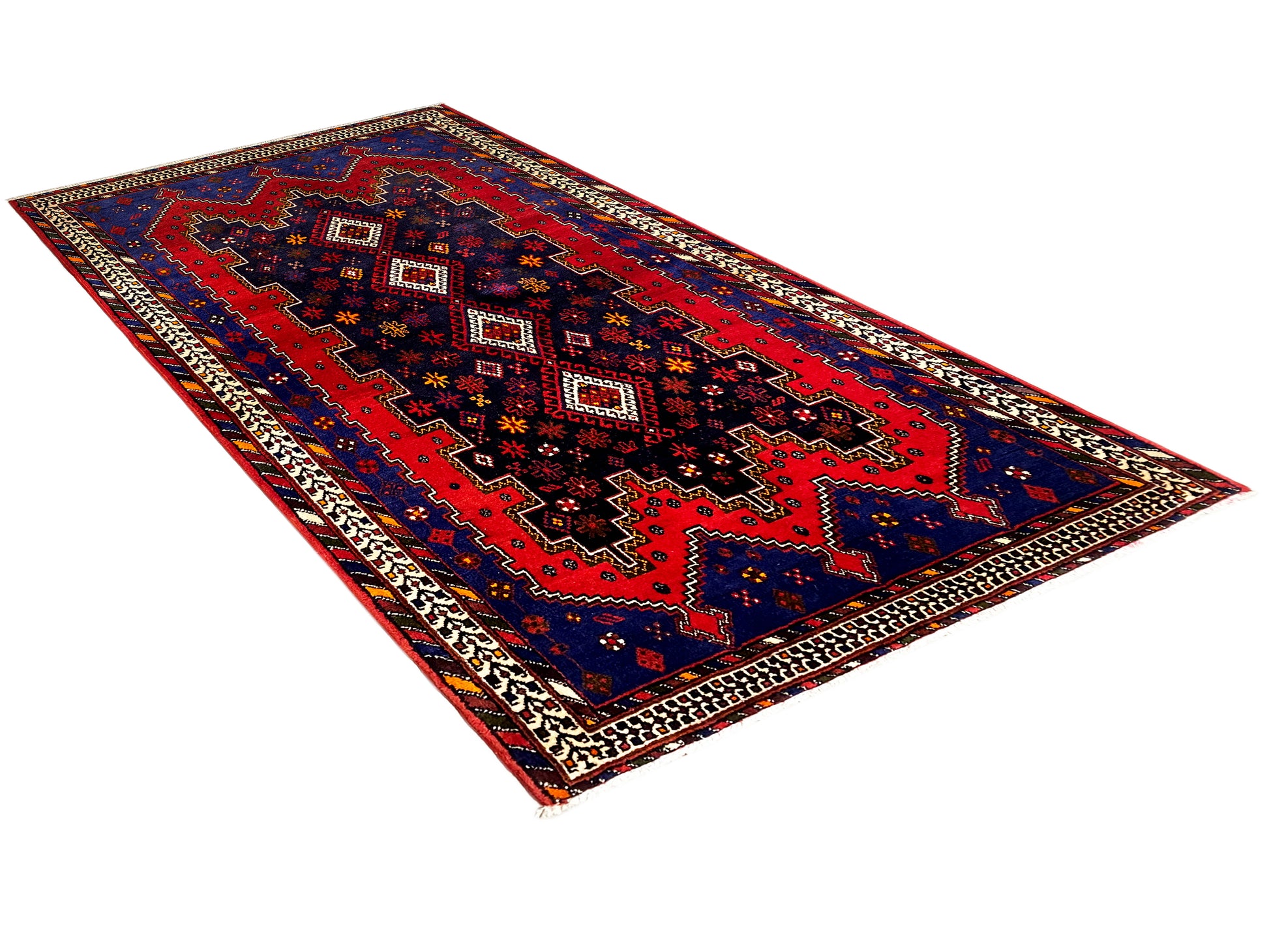 Dieser handgeknüpfte Sirjan Läufer Teppich aus der Region Sirjan im südlichen Persien (Iran), gefertigt aus hochwertiger, handgesponnener Wolle, präsentiert ein charakteristisches und traditionelles Design in tiefen Dunkelblau- und Rottönen, akzentuiert durch helle Details. Mit seinen Maßen von 208x107 cm eignet er sich ideal, um Flure, Eingangsbereiche oder schmale Räume stilvoll zu betonen. Das markante geometrische Muster mit sich wiederholenden Rautenmotiven und stilisierten floralen Elementen in den Bordüren spiegelt die traditionelle Knüpfkunst der Sirjan Region wider. Die Verwendung von handgesponnener Wolle verleiht diesem Teppich eine besondere Textur und Langlebigkeit. Dieser Sirjan Läufer harmoniert wunderbar mit rustikalen, traditionellen und ethnisch inspirierten Einrichtungsstilen und verleiht jedem Raum eine warme, authentische und charaktervolle Atmosphäre. Dieser Teppich ist nicht nur ein Bodenbelag, sondern ein Fenster in die reiche Tradition persischer Teppichkunst und ein Ausdruck von Stil und Individualität.