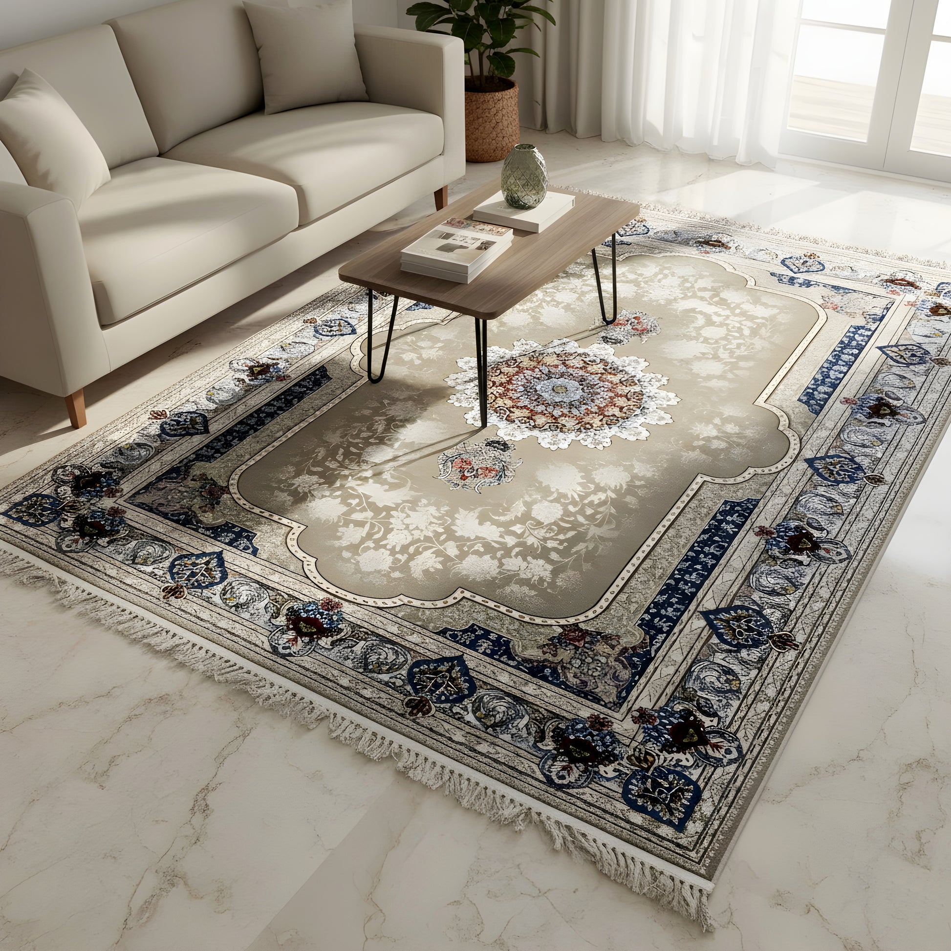 Verleihen Sie Ihrem Zuhause mit dem klassischen Teppich Timeless Sorur einen Hauch von zeitloser Eleganz. Das kunstvolle zentrale Medaillon in leuchtenden Farben hebt sich von einem sanften grauen Feld ab, das von einer raffinierten Bordüre mit aufwendigen Mustern in sattem Marineblau und Weiß eingerahmt wird. Gefertigt aus 100% hitzebehandeltem Acryl, ist dieser weiche und strapazierfähige Teppich perfekt für stark frequentierte Bereiche und verbindet traditionellen Stil mit moderner Widerstandsfähigkeit. Die großzügige Größe von 170x240cm ist ideal, um Ihrem Wohn- oder Schlafzimmer einen eleganten Blickfang zu verleihen.