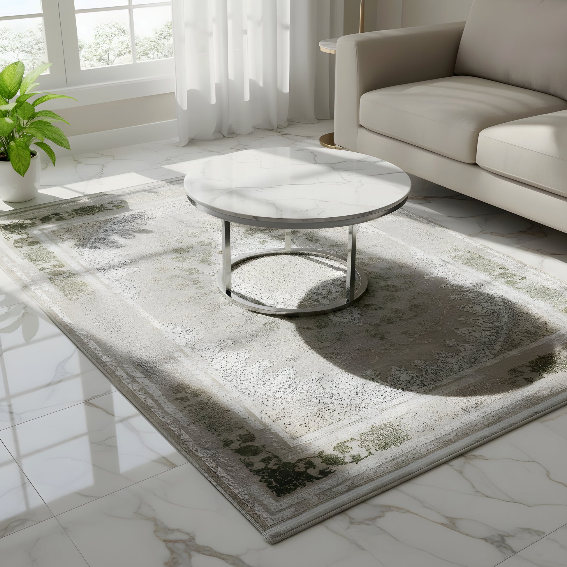 Verleihen Sie Ihrem Zuhause eine luxuriöse, zeitlose Atmosphäre mit diesem wunderschönen klassischen Teppich. Das markante zentrale Medaillon und das detailreiche Muster in schimmernden Silber- und Grüntönen heben sich elegant von einem rauchigen, dezent verblichenen Hintergrund ab. Gefertigt aus 100% hitzebehandeltem Acryl, ist dieser weiche und strapazierfähige Teppich perfekt für stark frequentierte Bereiche. Die großzügige Größe von 170x240cm ist ideal, um Ihrem Wohn- oder Esszimmer einen stilvollen Akzent zu verleihen.
