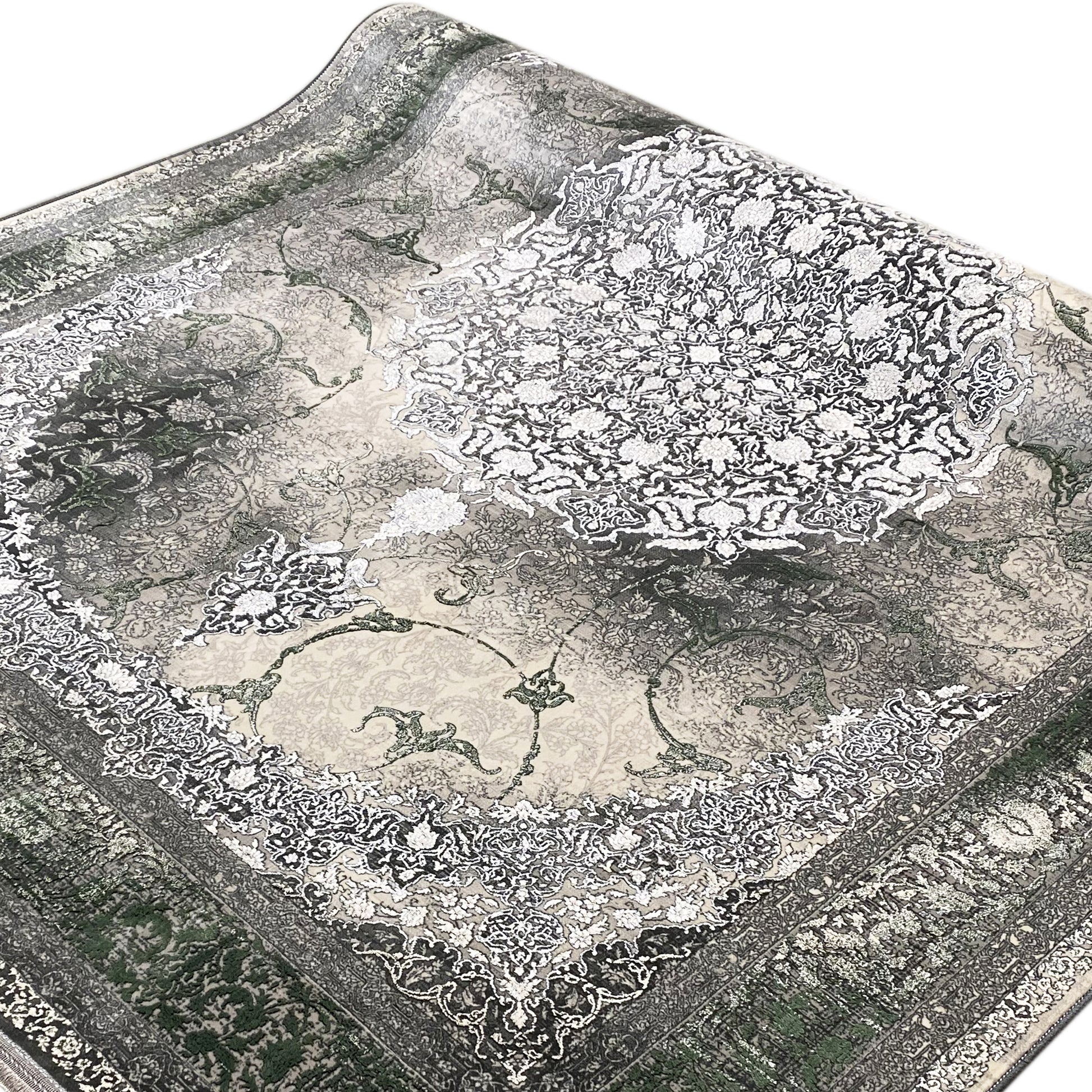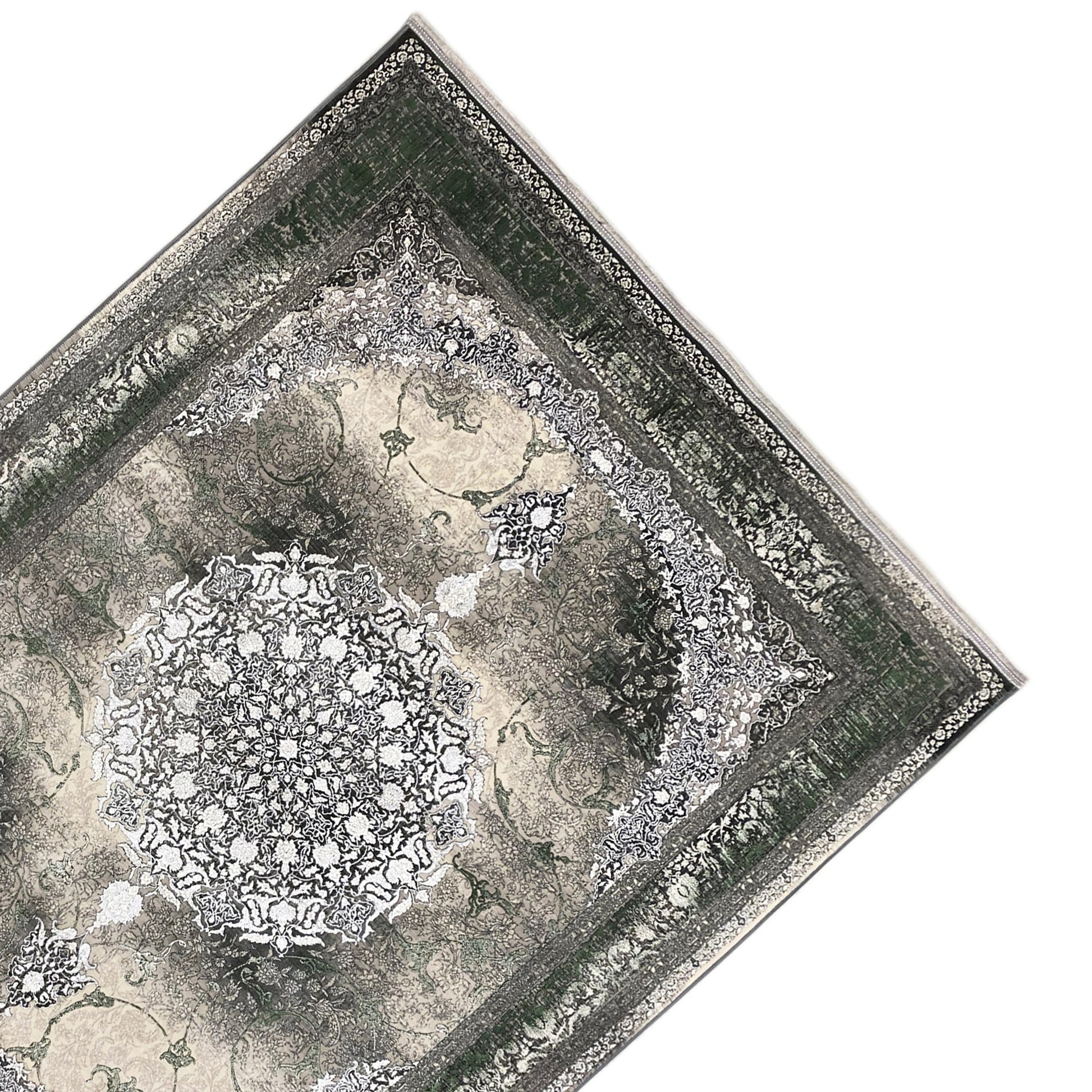 Verleihen Sie Ihrem Zuhause mit diesem wunderschönen klassischen Teppich einen Hauch von luxuriöser Eleganz. Das kunstvolle zentrale Medaillon in Hellgrau und Cremetönen hebt sich von einem rauchigen, dezent verblichenen Hintergrund ab, der von einer satten grünen Bordüre eingerahmt wird. Gefertigt aus 100% hitzebehandeltem Acryl, ist dieser weiche und strapazierfähige Teppich perfekt für stark frequentierte Bereiche, da er luxuriösen Stil mit moderner Widerstandsfähigkeit verbindet. Die großzügige Größe von 170x240cm ist ideal, um Ihrem Wohn- oder Schlafzimmer einen eleganten Blickfang zu verleihen.